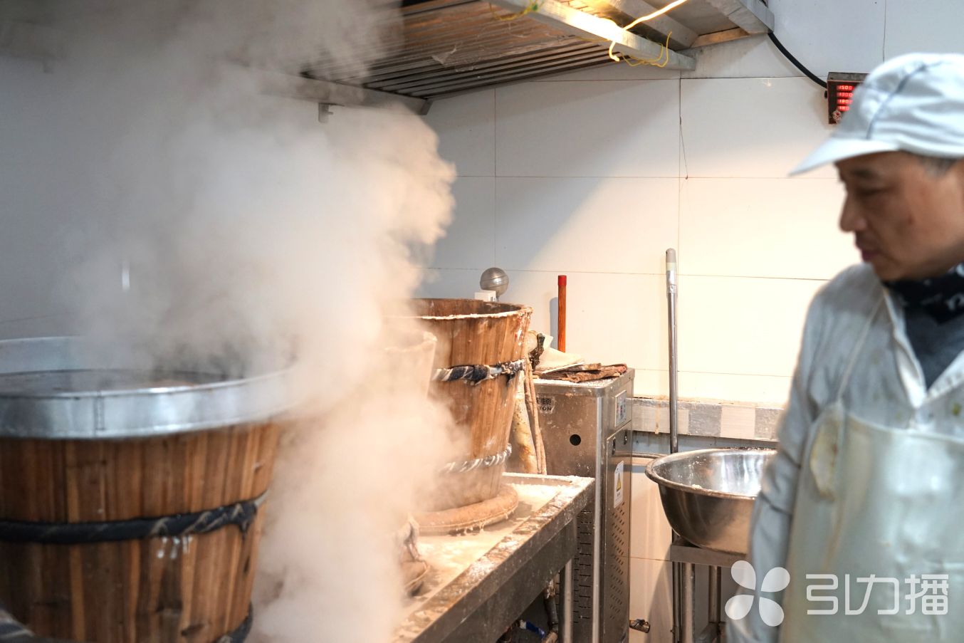 灶上蒸煮糯米,吴师傅在旁守着。实习生 陈慧茹/摄