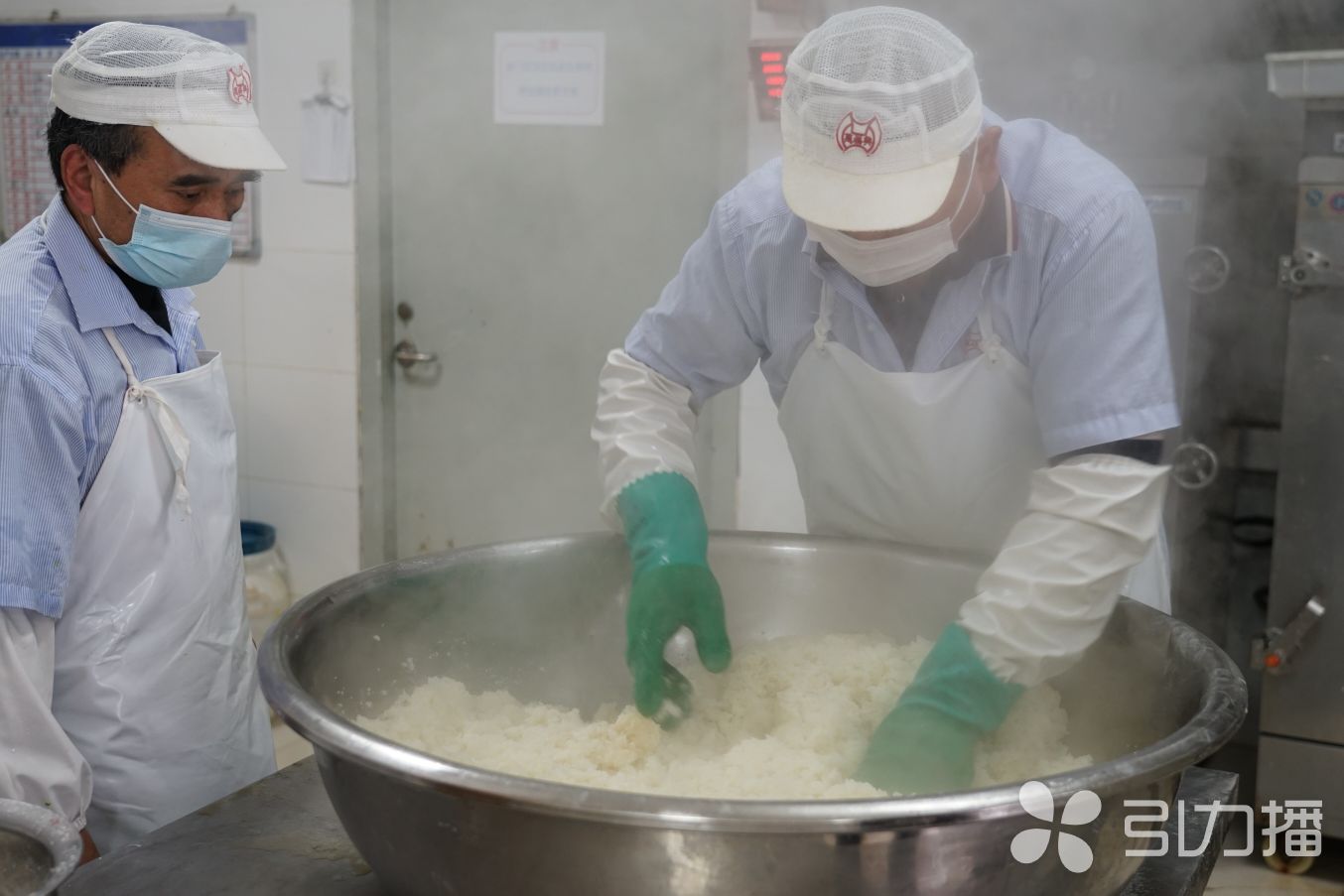 拌匀的糯米,到了王师傅和赵师傅手上,成为最后一道工序的主要原料。这次,她们要将糯米装填到碗中,将碗填满,并将碗口抹平。不锈钢盆中,糯米的热度还未散去,好在王师傅和赵师傅手快眼快,不容易被烫到。