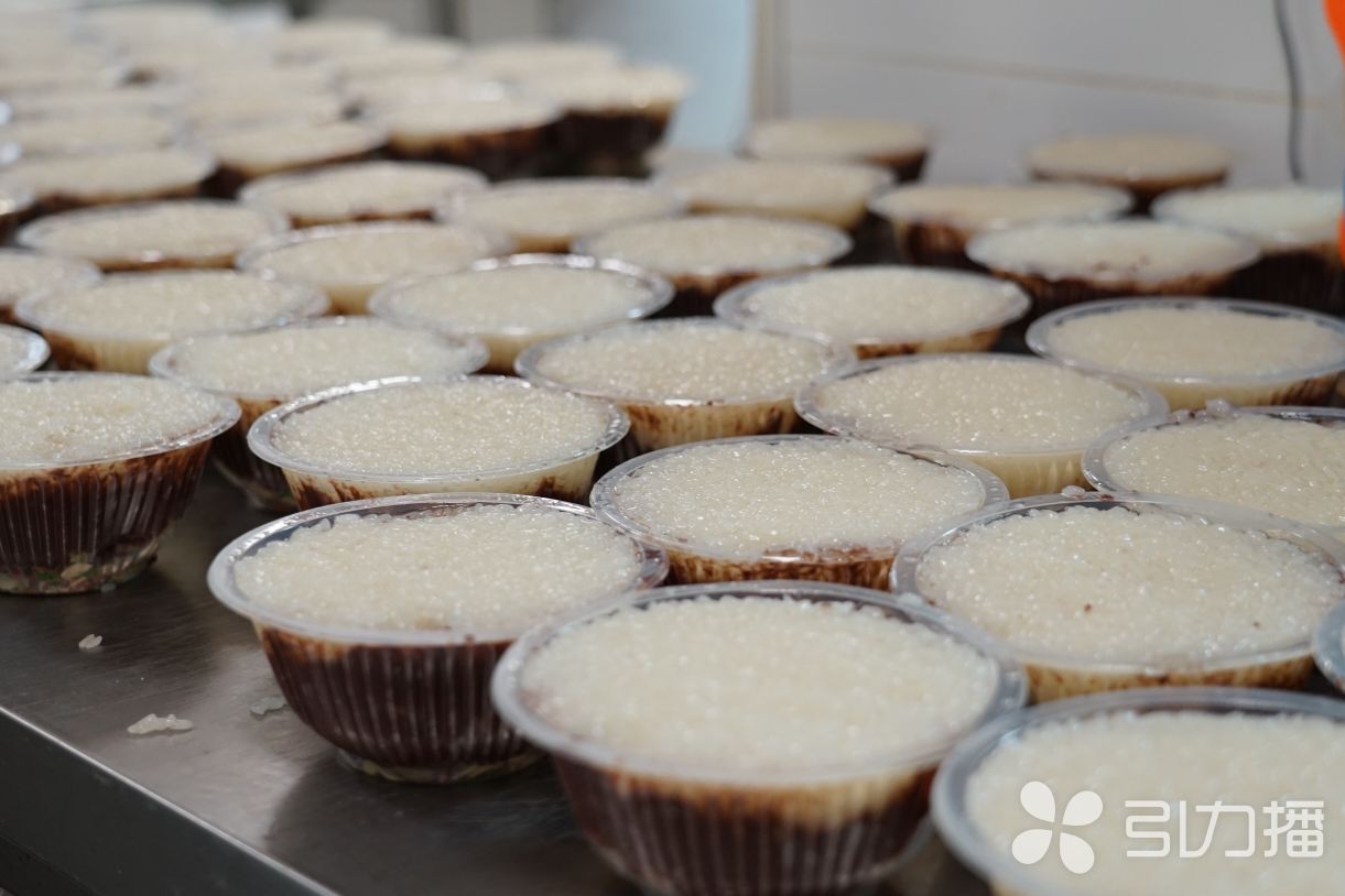 一阵忙碌,上百份八宝饭摆满台面,等着散热,这是为了封装,属于现在的工艺。封装好的八宝饭,可以冷藏保存,要吃的时候,热一下反扣在碗里,就是一份传统造型的八宝饭。