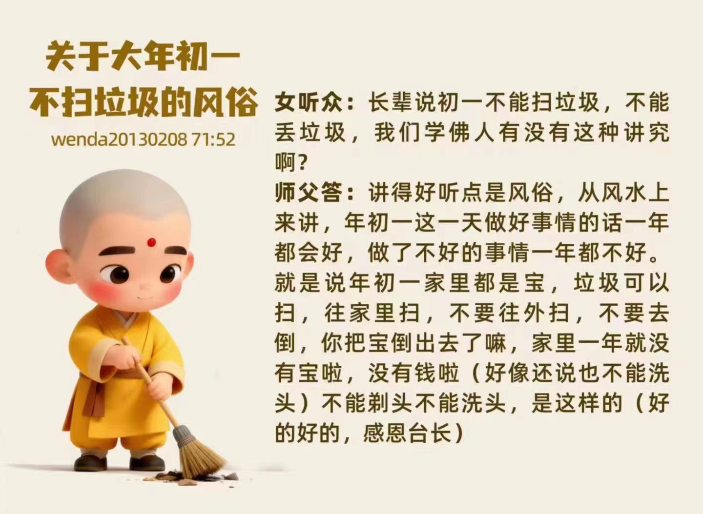 大年三十、初一早上上香祈求新的一年财运好,求身体健康,求家人平安吉祥,希望在福禄寿方面能更好地延绵。那怎样才能得到福寿双全?就是在人间多做善事,一分善,十分福;十分善,百分福;百分善,福延绵。