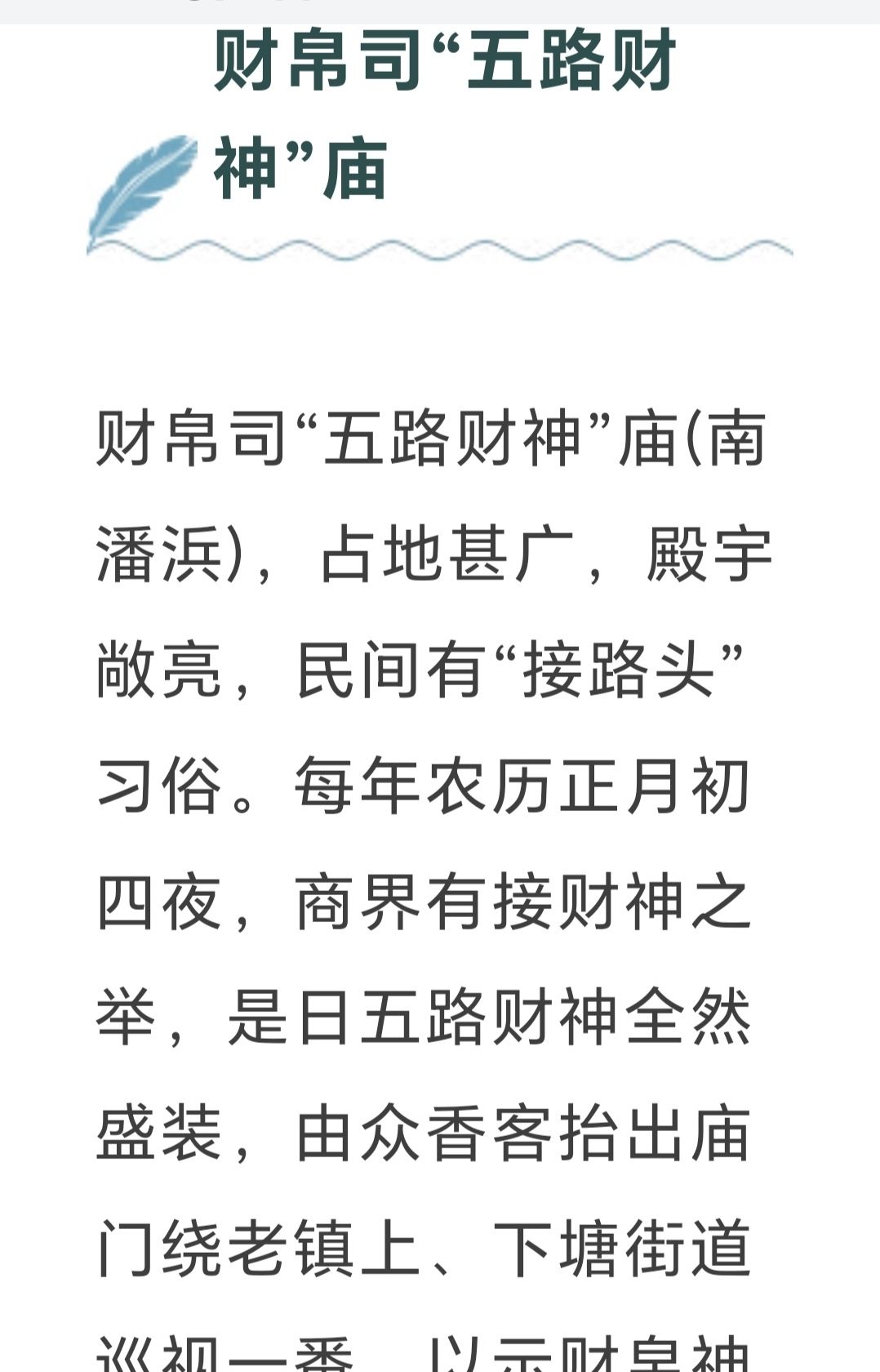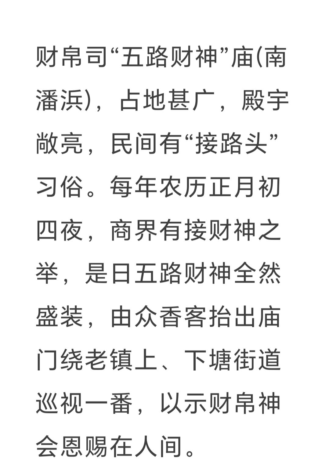 财帛司“五路财神”庙(南潘浜),占地甚广,殿宇敞亮,民间有“接路头”习俗。每年农历正月初四夜,商界有接财神之举,是日五路财神全然盛装,由众香客抬出庙门绕老镇上、下塘街道巡视一番,以示财帛神会恩赐在人间。