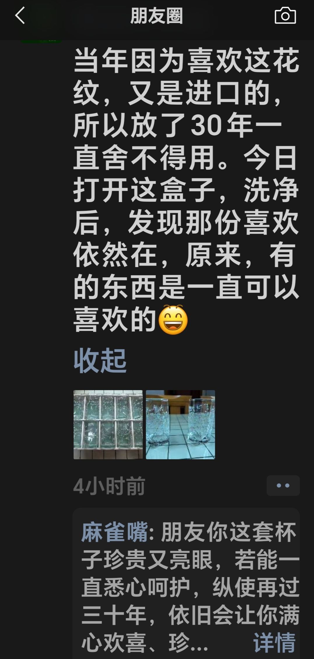 朋友: “当年因为喜欢这花纹,又是进口的,所以放了30年一直舍不得用。今日打开这盒子,洗净后,发现那份喜欢依然在,原来,有的东西是一直可以喜欢的[憨笑]”