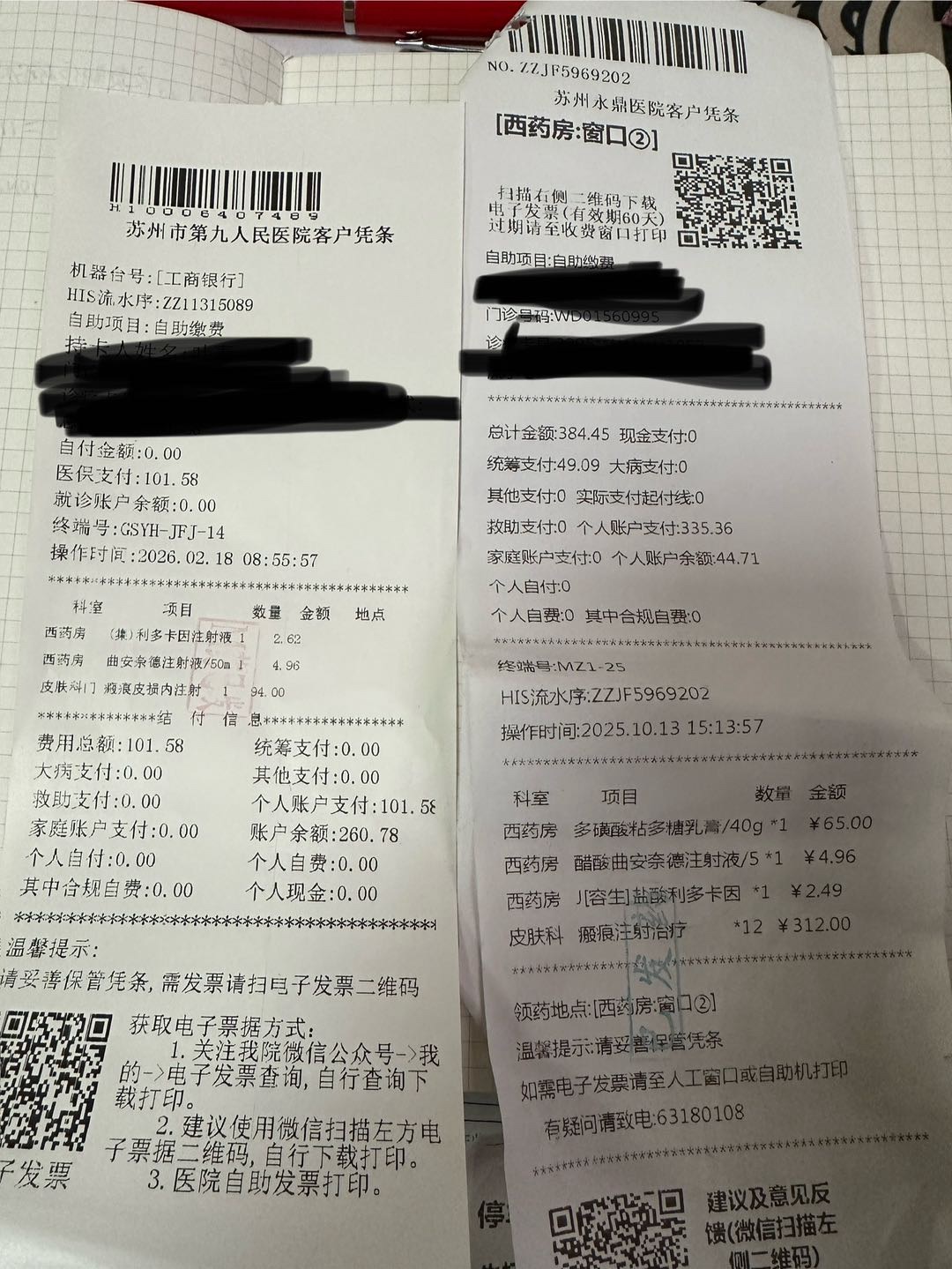 前年做个了微创手术,伤疤处长了疤痕时常会痒。25年10月份去永鼎医院医院皮肤科看病一下子花了300多块,感觉有点贵想想就一疤痕没啥大问题费用也贵,就看了一次后就没有再去。今天过年天气好疤痕一直痒比较难受初二的时候去九院看了一下,同样的治疗方案同样的药,只花了101.58。二个价格相差200多。我打电话去永鼎医院医院咨询皮肤科说他们对疤痕有个最低消费只要疤痕小于5mm全部都是这个价。真心想不到看病现在也有最低消费。