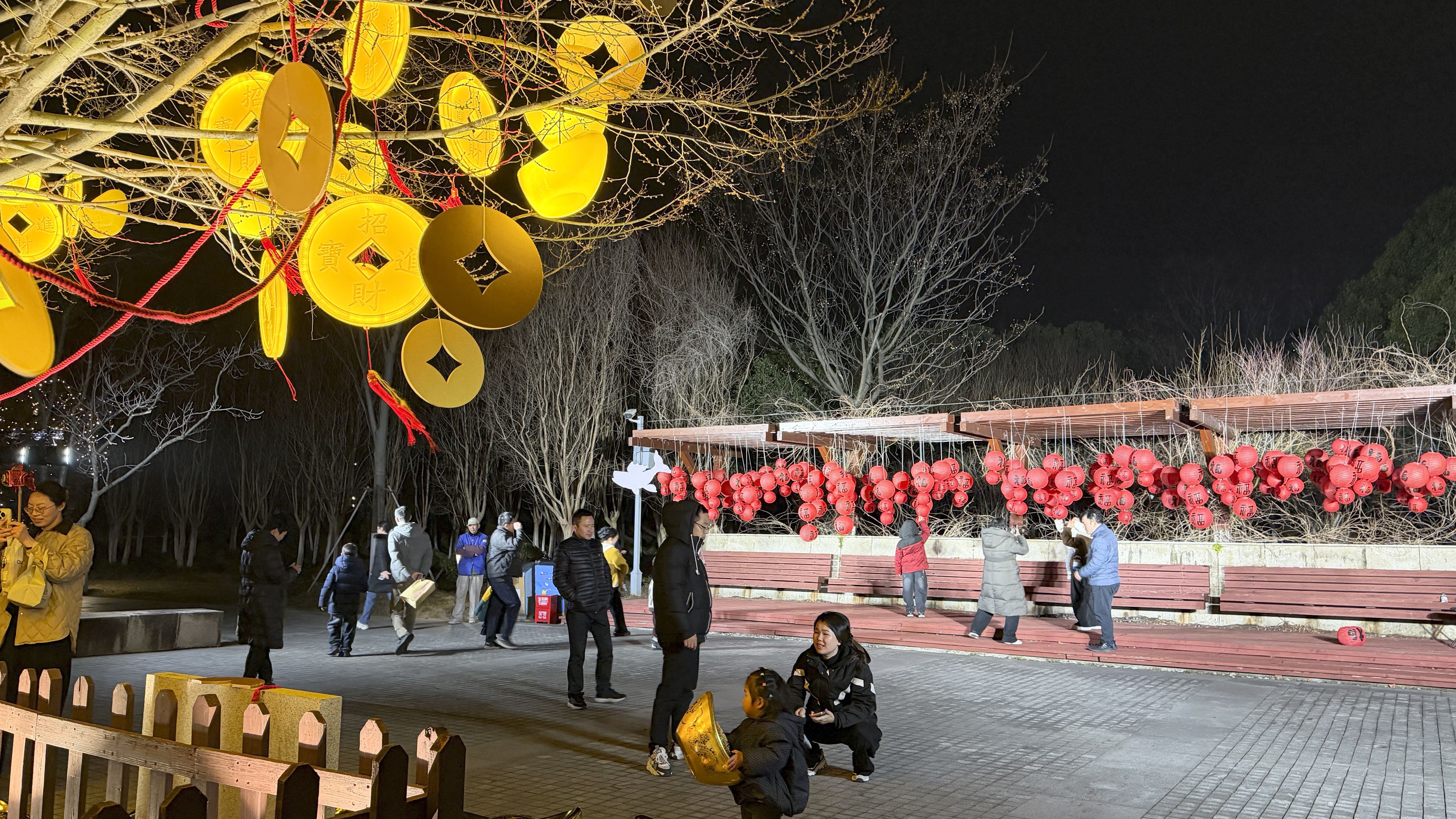 创意说明:金黄铜钱如雨洒落枝头,赤红灯笼似谜悬于廊下;视觉对比强烈,寓意吉祥翻倍,欢乐加倍。