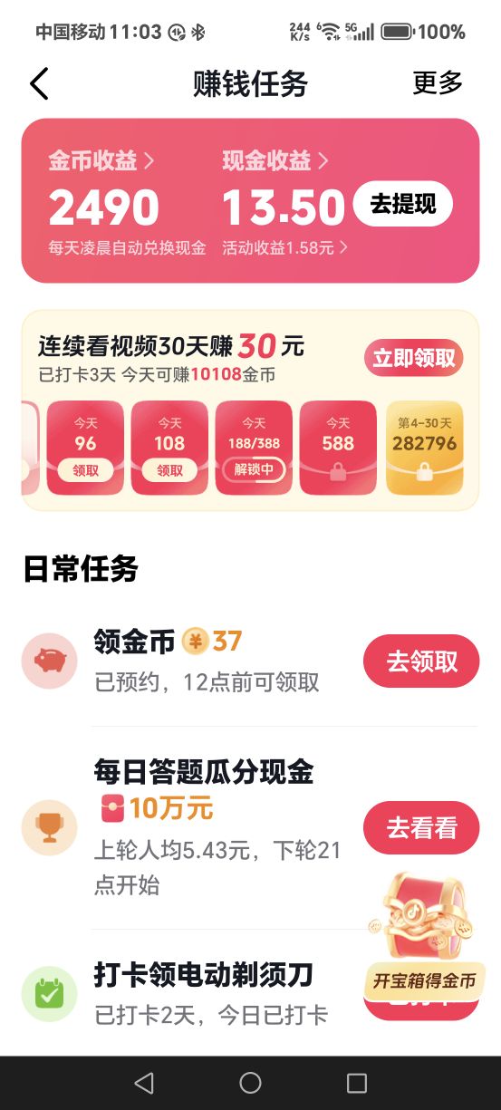 近几个月迷上了个学习班,每晚七点学到九点,睡得自然晚了,入睡时间推到十点半、十一点。即便服了安眠药,凌晨两点多还是会醒,再想睡,难如登天。没法子,便拿起手机在软件里“掘金”,攒些金币换零钱。昨天白天到睌上竟在抖音极速版里掘到五万八千金币,能换五块八毛钱,这样的“幸运日”可遇不可求,一年遇不上几回,平时忙一天,常常只有几毛收获。掘金累了,喝口水,迷迷糊糊间,坠入一段短梦中。