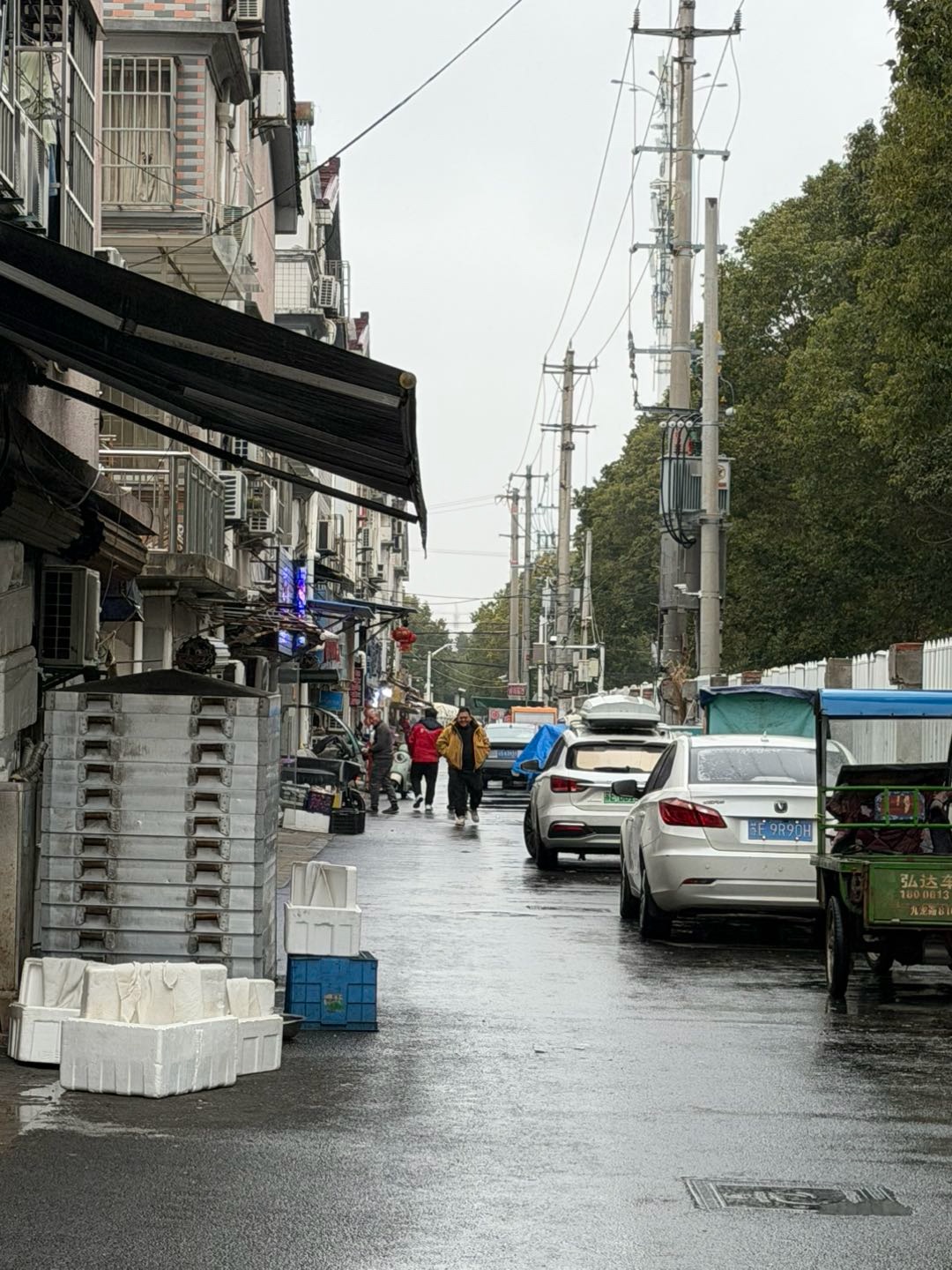 一边商铺外摆严重,另一边还要停汽车,有些车又不能规范停车导致出入困难