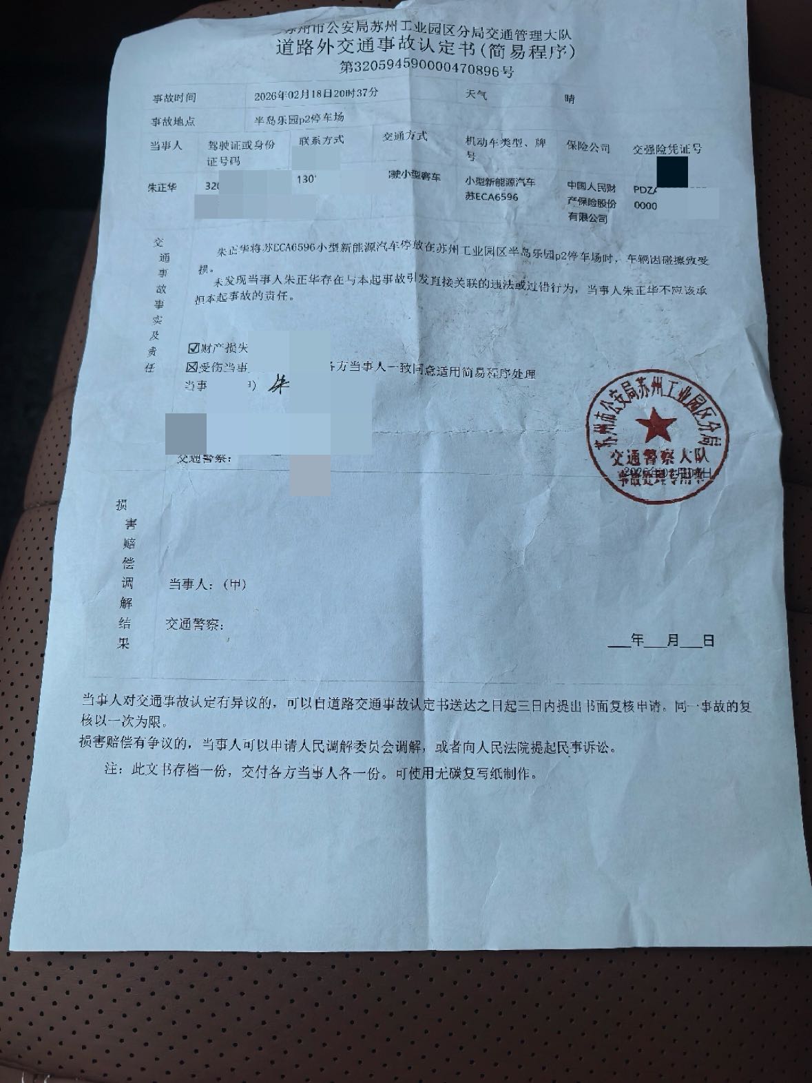 本人于2026年2月18日前往阳澄湖半岛乐园游玩,车辆停放在P2停车场。游玩结束后取车时,发现车辆左侧车门位置发生剐蹭损伤。