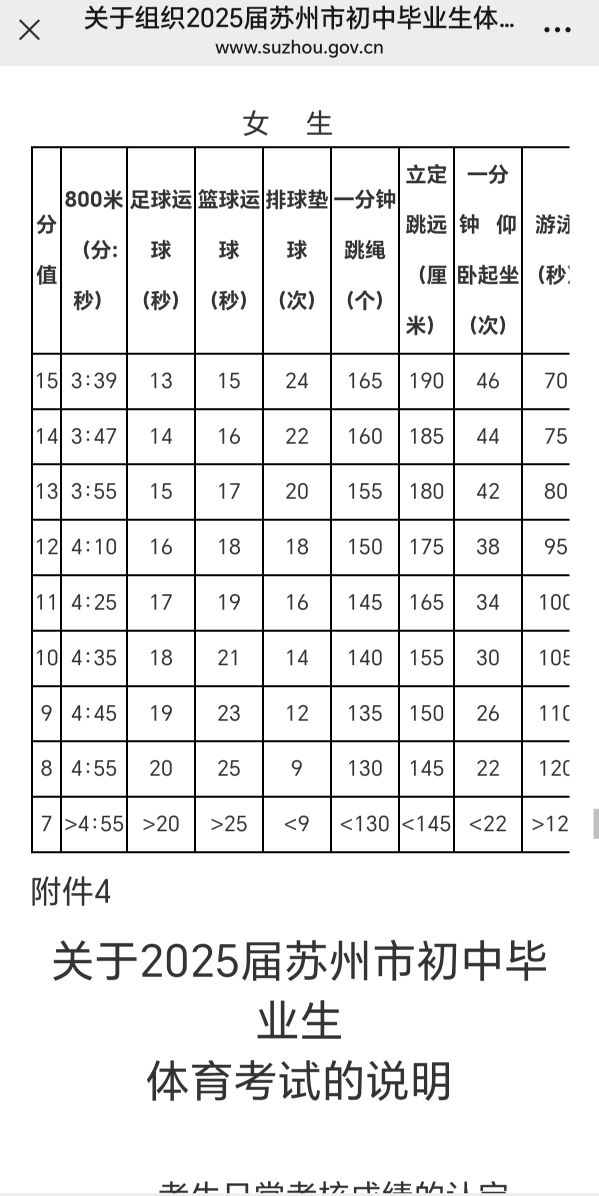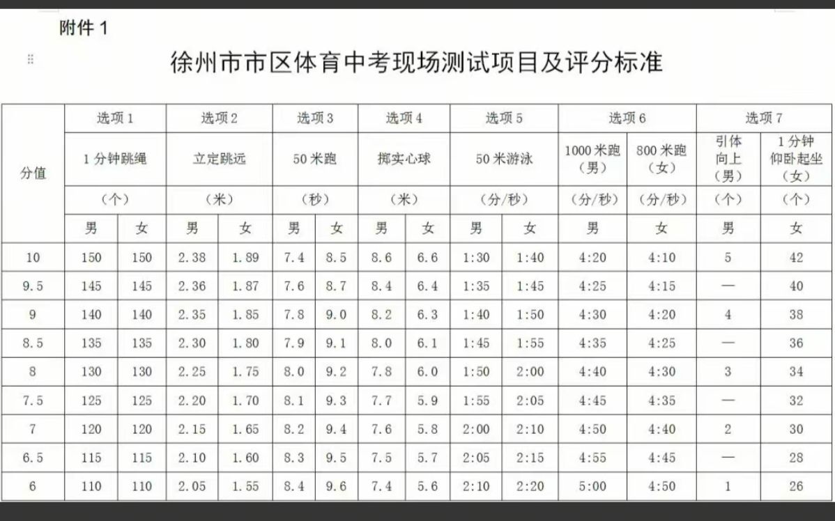 苏州体育中考女生800米满分3分39秒,徐州4分10秒。差距21秒之多。一分钟跳绳苏州满分165个,徐州只要150个。1分钟仰卧起坐苏州满分46个,徐州只要42个。徐州都是选测,苏州男生1000米,女生800米必测。