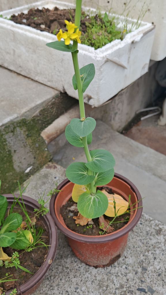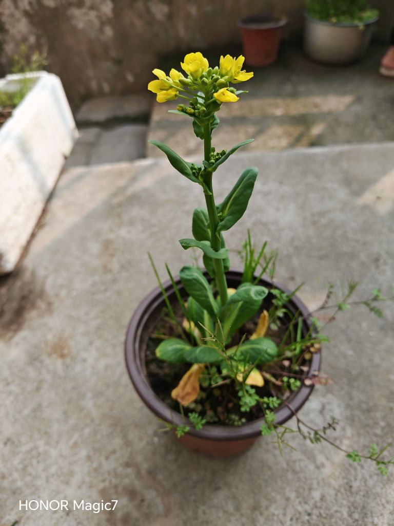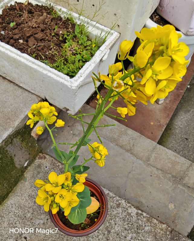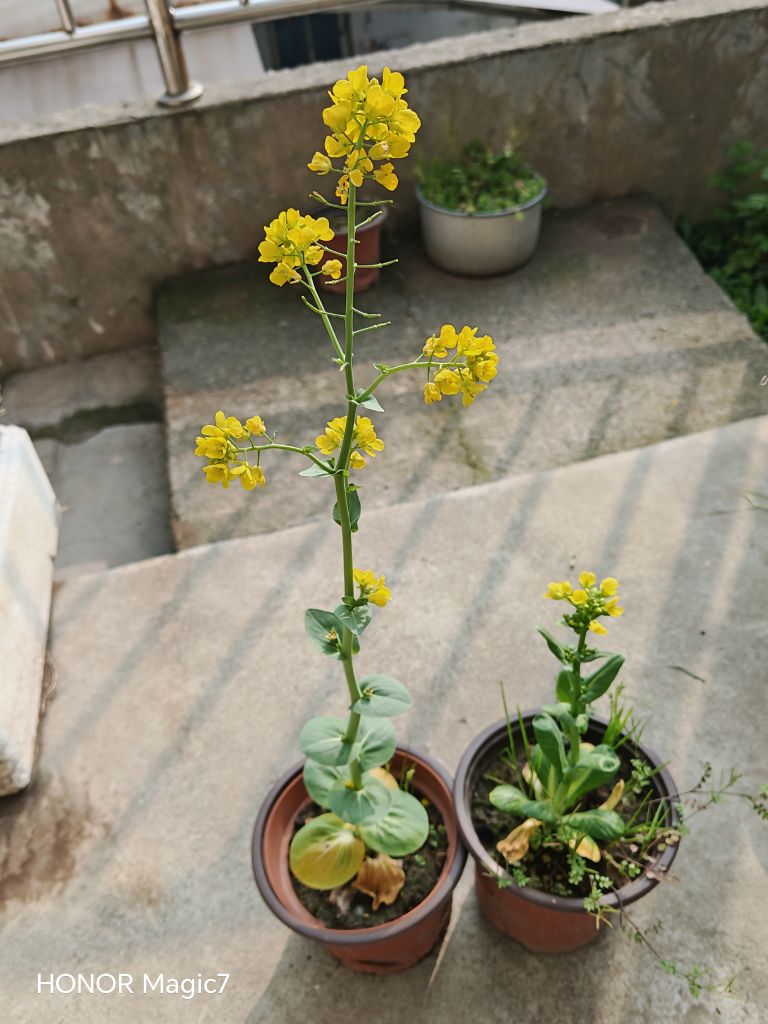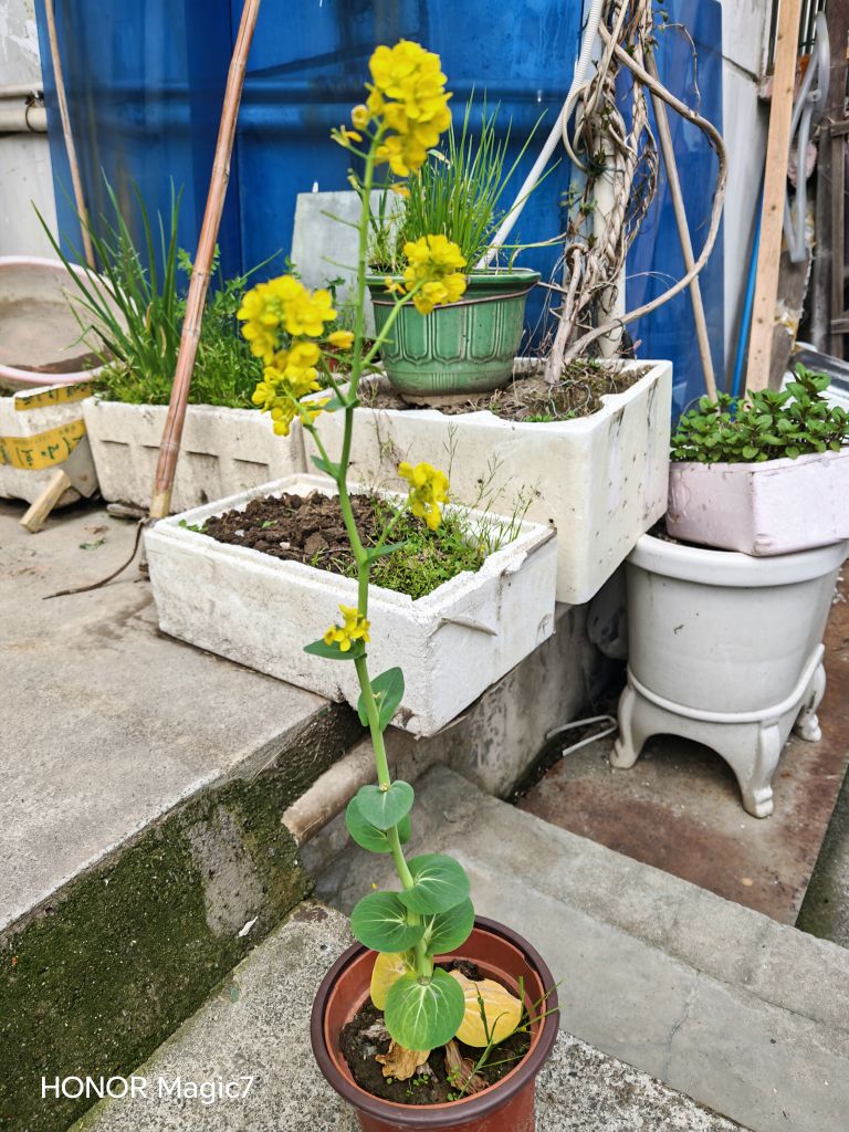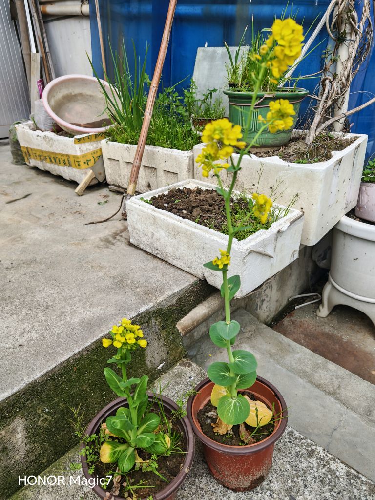 去年从网上买了包菜籽,种在泡沫箱里几个月,只长成一寸多长的小菜,后来拔了二根种在小花盆里,不经意间长成了参天大菜