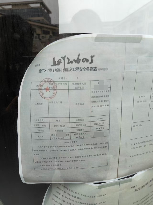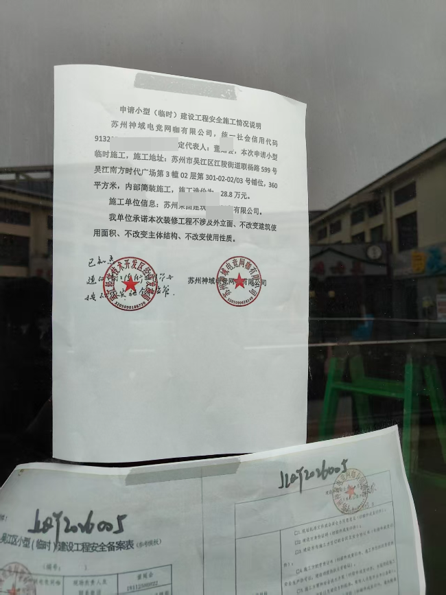如题,长安实验小学边的网吧终究快要开了!前前后后,陆陆续续投诉最终还是抵挡不住各种“操作!       2025年11月14日东太湖论坛江陵街道社区发帖投诉,长文叙述“神域电竞”疑似存在:1、距离不足两百米;2、未批先建,装修未向相关部门报备审批;3、更改建筑原有消防通道。三个问题涉及几个相关部门,2025年11月28日,相关部门陆续回复相应问题。 吴江经济开发区回复说经江陵街道相关部门了解相关网吧装修已完成,已在物业备案。消防救援部门回复经现场核查该网吧未投用,已通知其去住建和消防办理相关手续。吴江住建回复已现场核实,项目面积295平方米,工程造价29.5万,无需办理施工许可证,属地备案。这里就已经出现了问题,开发区说物业备案,住建说属地备案。 根据“神域电竞”—ROG玩家国度电竞馆门口吴江小型(临时)建设工程安全备案表可以看到,2026年01月26日才向属地江陵街道,吴江经济技术开发区备案。装修完成两个月才想起来备案?先上车后买票?同样根据这个备案表清楚的可以看到建筑面积360平方米,造价28.8万,与住建部门回复的完全不同,这个需不需要要办理“施工许可证”?备案表承诺不改变主体结构,那二楼原来的消防楼梯通道口是谁改变的,有没有完备的手续?同样三问,请相关部门谨慎回复!不要再出现事实与你们的回复不符的状况了!