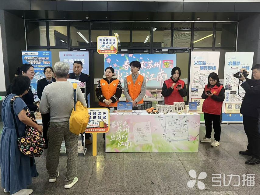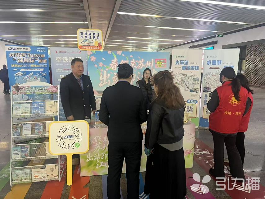 铁路苏州站客运车间党支部副书记孙梦婷介绍,为保障活动顺利开展,苏州站在负一楼地下通道(近地铁4号口)设置专门服务点位,每日安排工作人员与志愿者提供现场引导、活动咨询、政策讲解、宣传手册发放等服务。现场还通过背景板、易拉宝等形式,集中展示游船优惠、空铁联运、轻装行等便民服务信息,在不影响旅客通行的前提下,全方位推介苏州文旅资源。