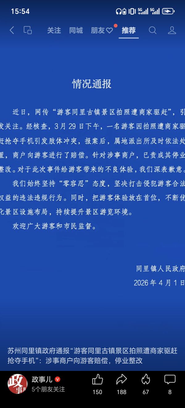 同里商家驱赶消费者抢夺手机导致消费者受伤,无良商家也被整改。