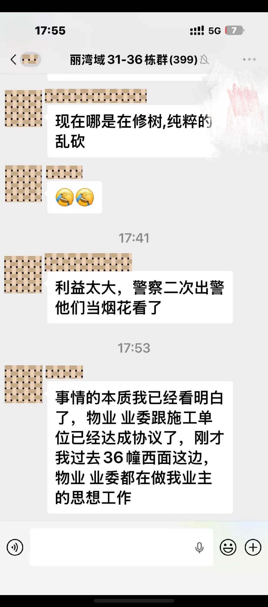 物业和业委会勾结,为了把树修成光秃秃,物业经理把投诉人员的信息泄露给御前侍卫,不知道是不是又准备集合人去投诉人家门口围堵