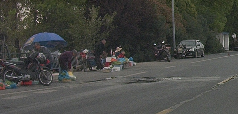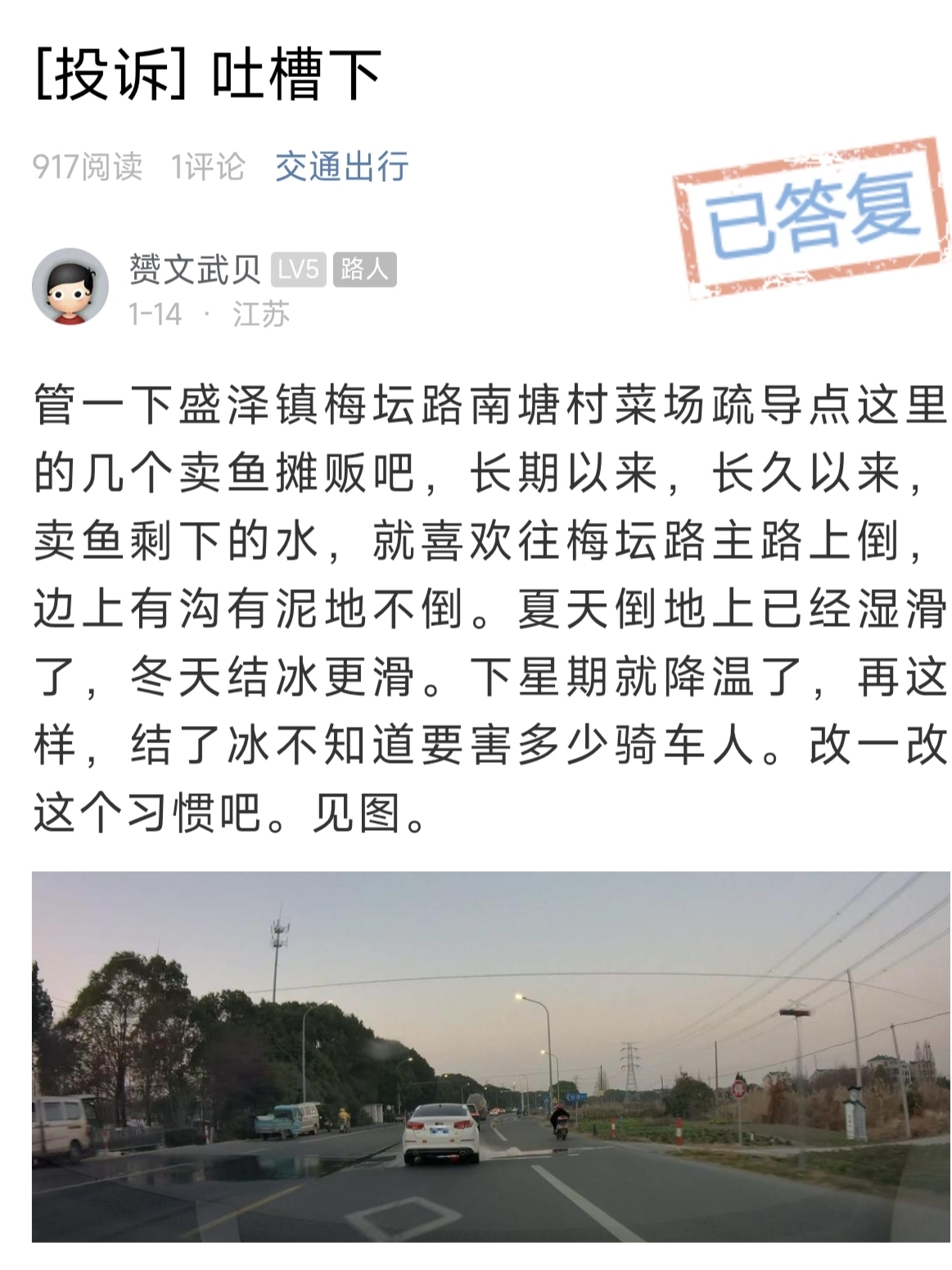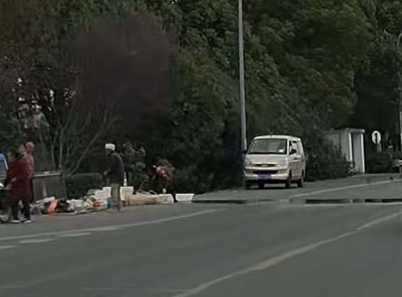 盛泽镇梅坛路南塘村菜场疏导点这里,摆在梅坛路大马路边上的卖鱼摊贩,还是往马路中间倒养鱼水。