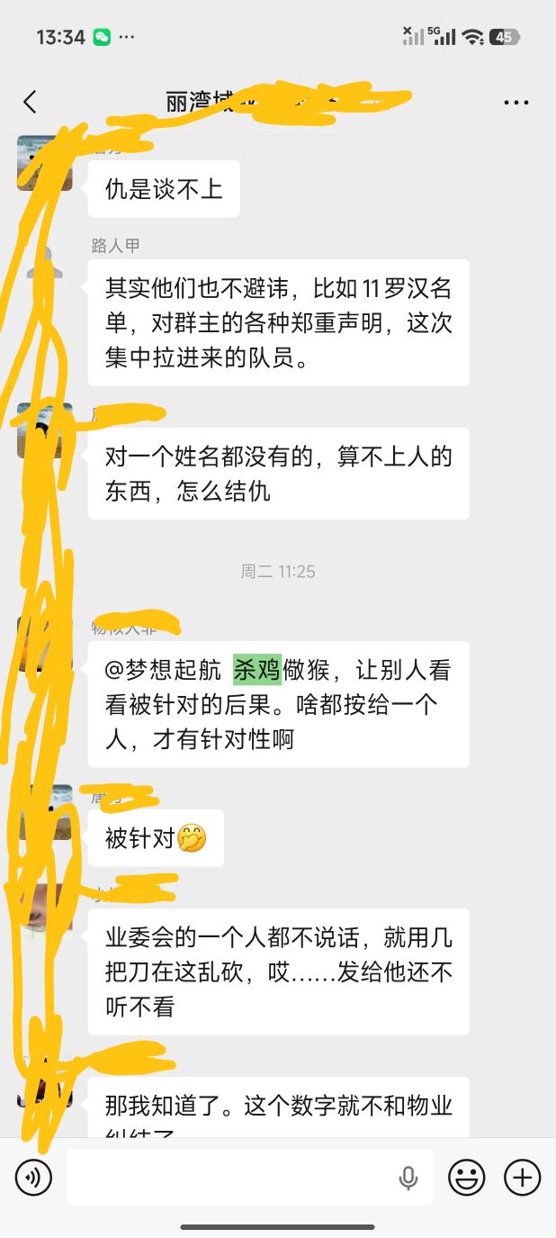 业主群聊天 一个业主可以把聊天业主手机号找出来 好私发信息去威胁业主 应该是挡他们做工程了吧 这个小区没有什么部门去监督一下 估计后面会出点事