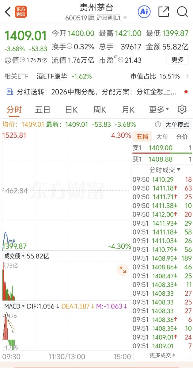 今天贵州茅台低开超4%,触及1400元整数关口。截至9时51分,贵州茅台报1409.01元/股,跌3.68%,总市值约1.76万亿元。