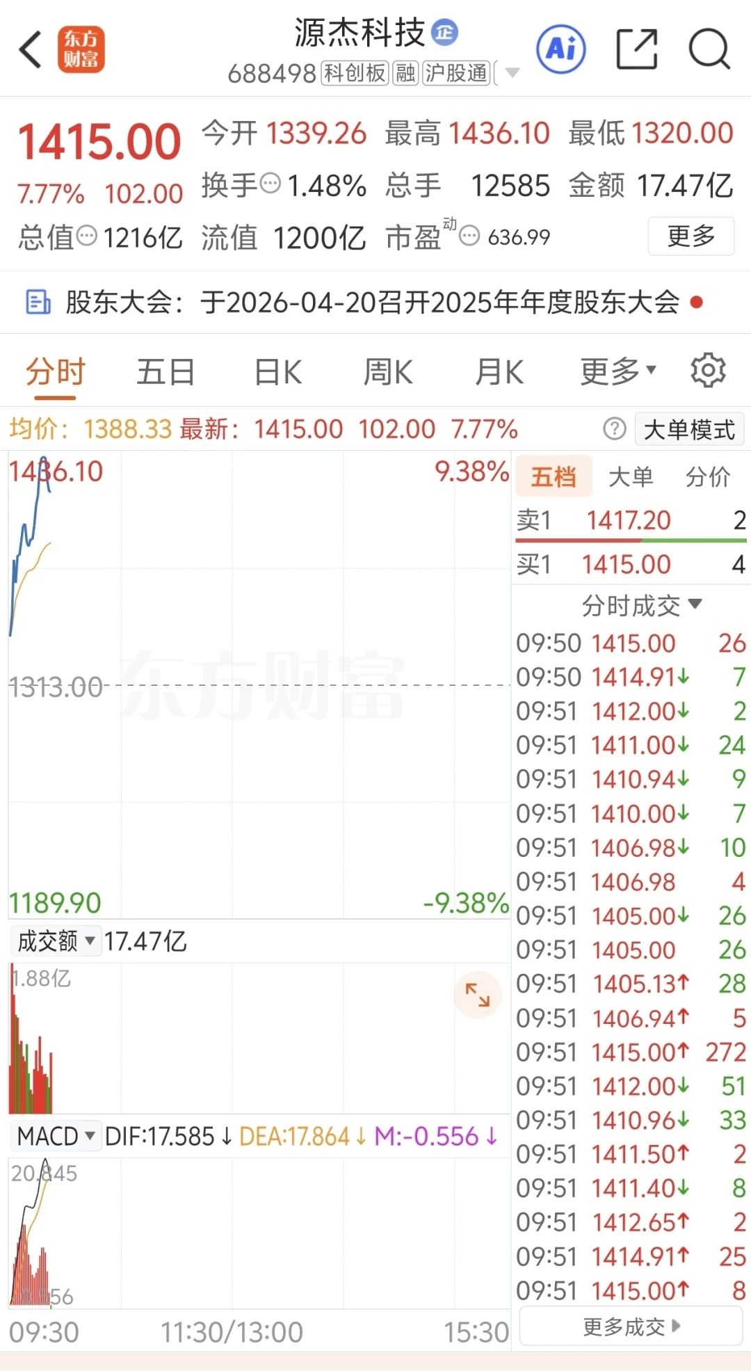 今天,源杰科技股价大涨,一度触及1436.1元/股。截至4月17日9时51分,该股涨7.77%,报1415元/股,盘中超过贵州茅台成为A股股价最高的公司。