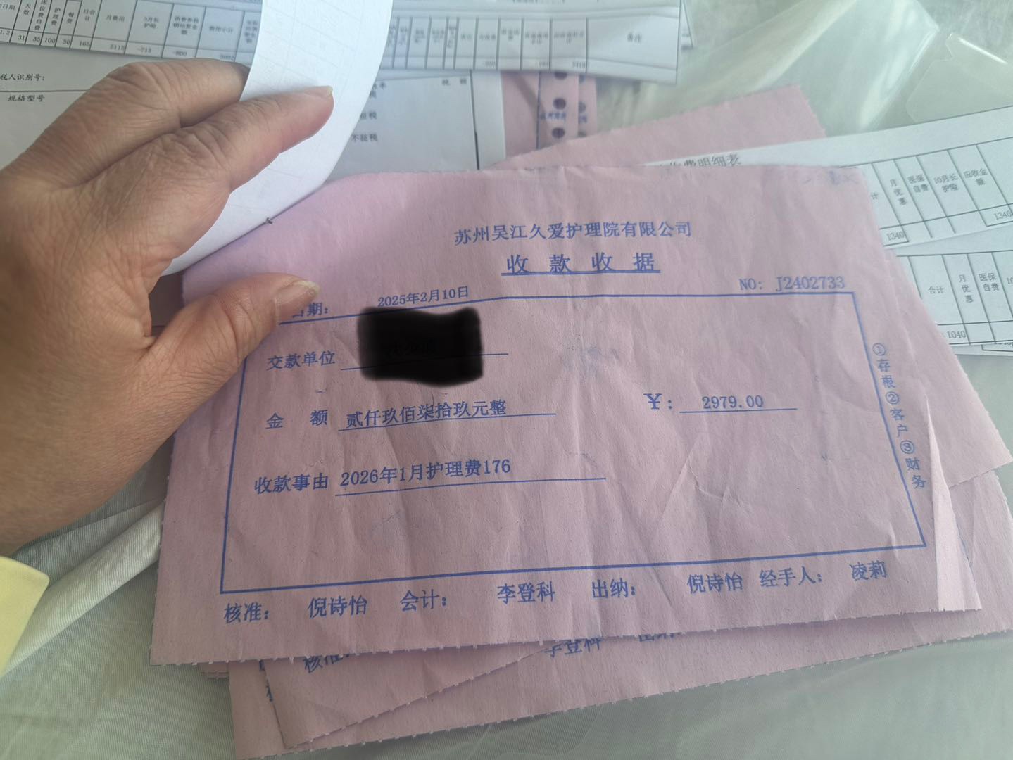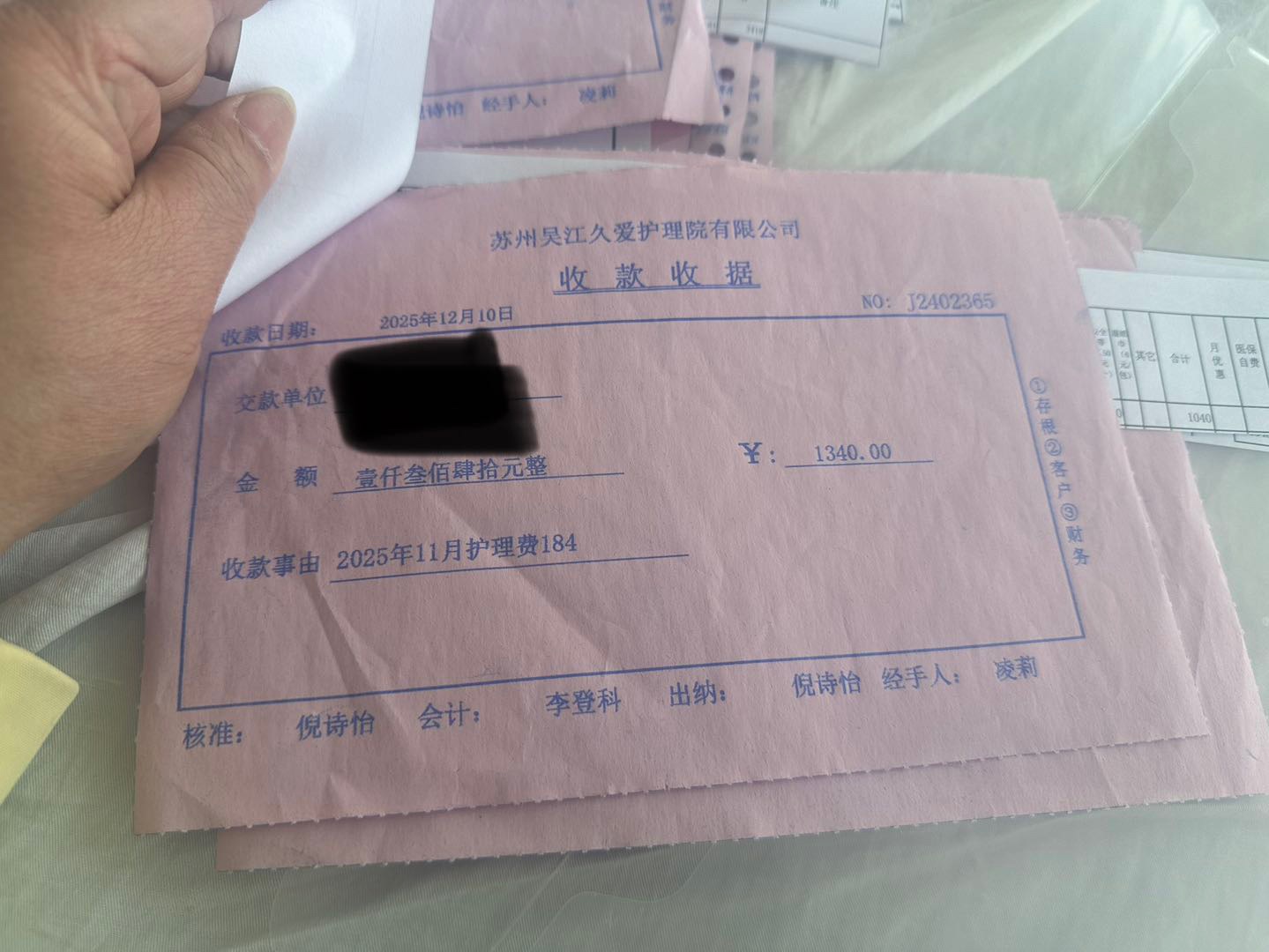 我是一名普通的百姓,也深知百姓维权的不易,但是该讲的道理,还是憋不住要讲出来,我家老人住在吴江久爱护理院,所谓的市场部就是请两个退休的妇女在那边主持工作,个人接触下来觉得首先是没什么文化,其次本职工作的工作内容也几乎搞不清楚,就是工作失职也有总经理给她撑腰,就算算错钱无非也就是总经理一句话单位给她补个窟窿,而所谓的总经理谈吐也是很让人震惊的(据工作人员介绍也是司机上位没有文化底蕴的)类似事件就我了解到的已经好几件了,另外的缴费没有发票,我还问过市场部的相关工作人员,怎么没有发票,她们说都是这种红单子!烦请相关部门重视并监督!谢谢!另外我想说,不管长护险还是消费券,都是国家给百姓的福利机制,作为服务部门,你善意提醒是可取的,但是这态度,大家有目共睹吧!